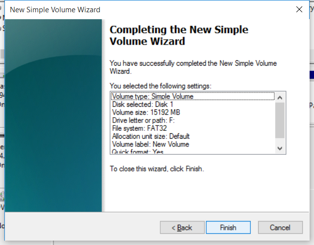 You do this by simply right clicking on the “Unallocated” disk and choosing “Format”. Be careful to choose FAT32.