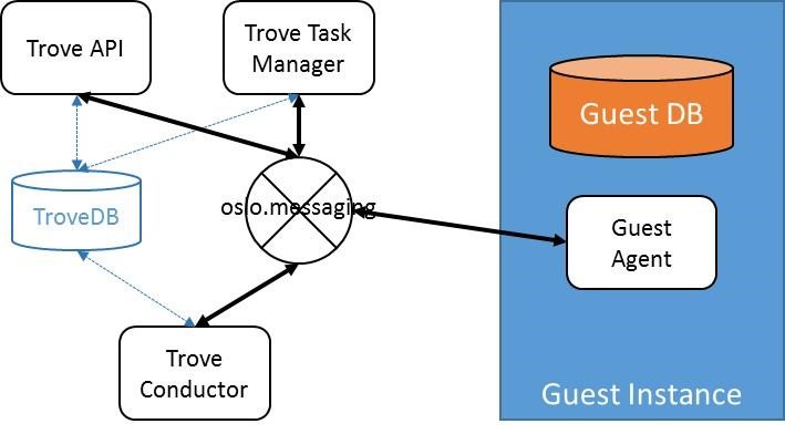 Shown here is a simplified representation of a Trove system with a single guest database instance. The control plane components (Trove API, Trove Task Manager, and Trove Conductor) and the Guest Agent communicate via oslo.messaging which is typically implemented with some messaging transport like RabbitMQ.